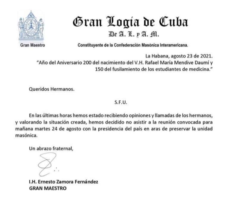 Mediante un mensaje público dirigido este lunes a la comunidad masónica cubana, el Gran Maestro (GM) de la Gran Logia de Cuba, Ernesto Zamora Fernández, notificó que no asistiría a una reunión programada con el gobernante de Cuba, Miguel Díaz-Canel. “En las últimas horas hemos estado recibiendo opiniones y llamadas de los hermanos, y valorando la situación creada, hemos decidido no asistir a la reunión convocada para mañana martes 24 de agosto con la presidencia del país en aras de preservar la unidad masónica”. Para seguir leyendo…