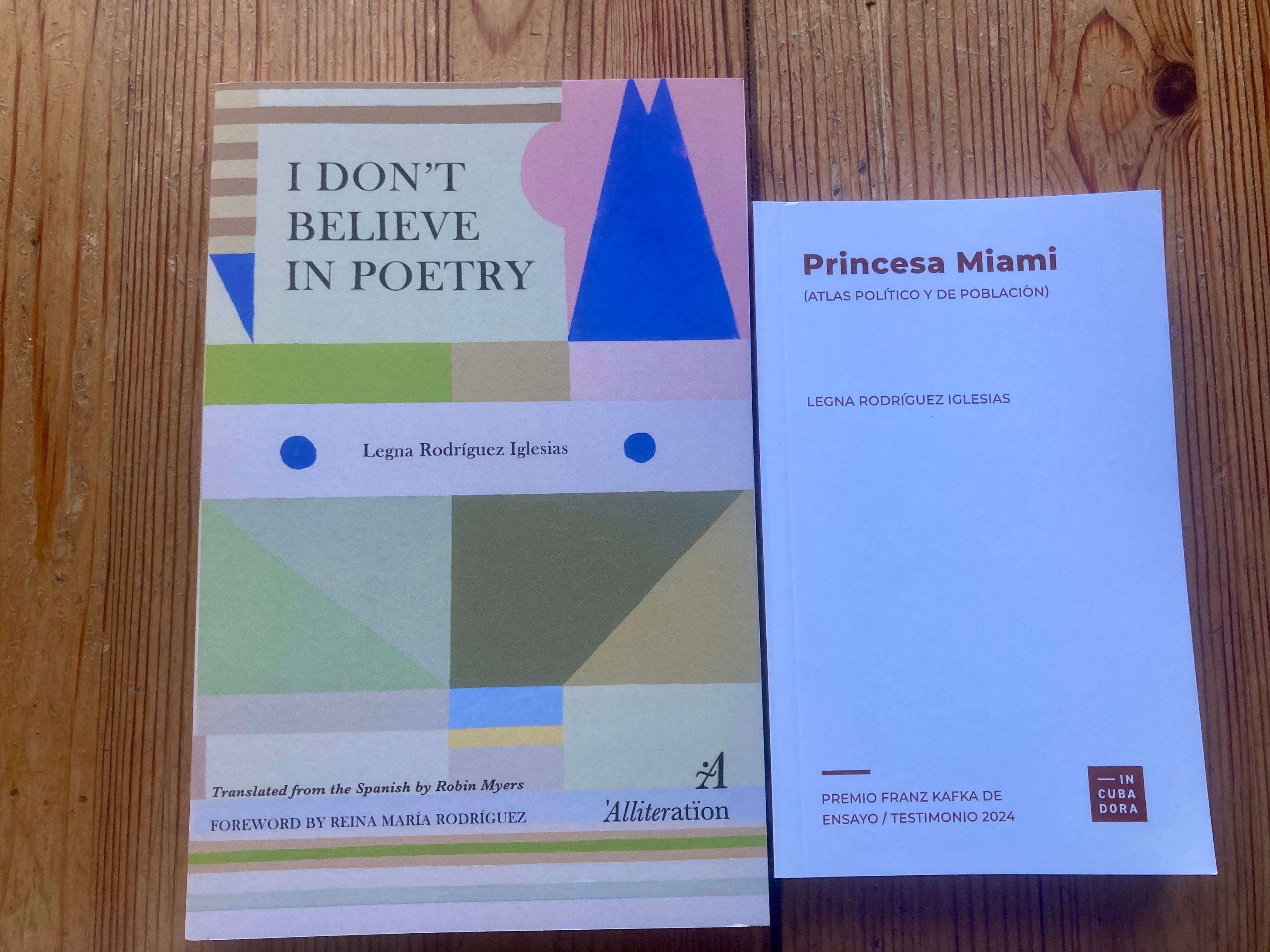 la edición bilingüe de No creo en la poesía, con traducción de Robin Myers (una chica muy maja que tiene una newsletter estupenda de poesía bilingüe en inglés y en castellano), la publica Alliteration, editorial venezolana en el exilio. el libro está prologado por Reina María Rodríguez, poeta cubana consagradísima, exiliada en miami. ya he hablado de ella en otras ocasiones. tuve la suerte de conocerla hace un par de años aquí en nueva york, y veo que de ella dije en mi entrega de junio de 2023: “Reina es una mujer bonita por dentro y por fuera, como Legna”, así que me copio y me pego a mí misma aquí porque lo sigo pensando.